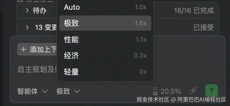 3.在生成完初版项目之后,使用智能体模式进行精调。最好使用极致模式,性能最好但消耗多。