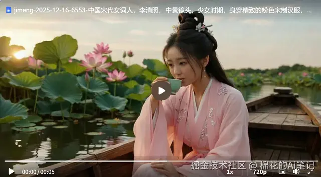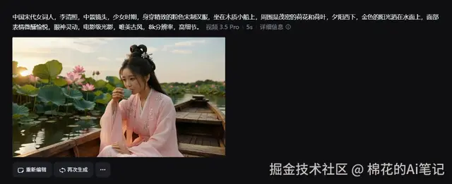 - 操作:直接输入文字描述 “李清照坐在木质小船上,周围是茂密的荷花...面部表情微醺愉悦”。