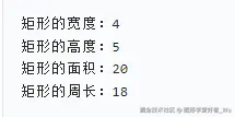 通过成员方法setWidth()和setHeight给对象的width和height属性赋值,然后通过getWidth()和getHeight()读取其属性信息,通过calculateArea()和calculatePerimeter()对属性数据进行运算,得出以下结果: