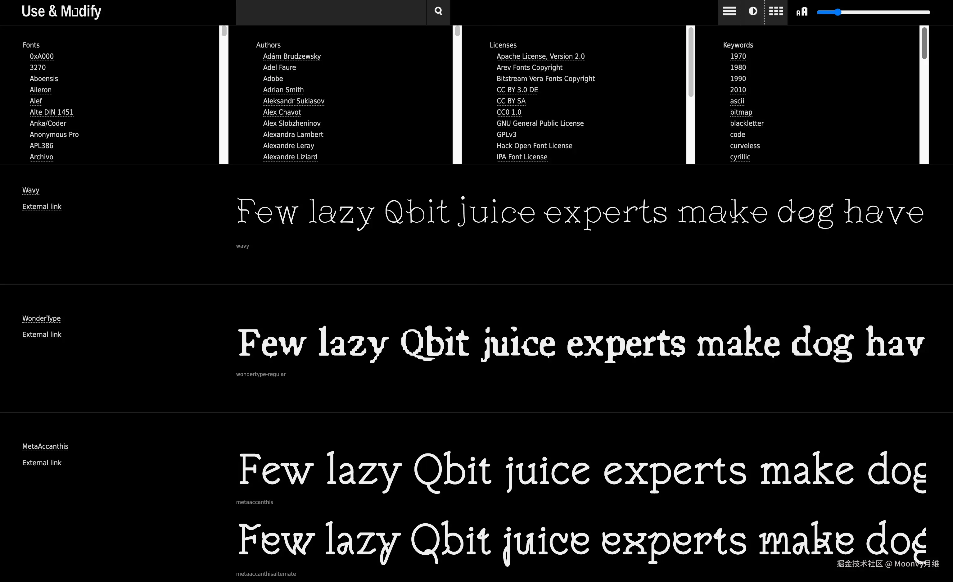 作者个人精选的漂亮、优雅、朋克、专业、不完整、怪异的英文字体。开源许可证使它们可以免费使用和修改。这些不常用的字体会有装饰页面的效果,适合做背景或者 banner 的时候多来逛逛。