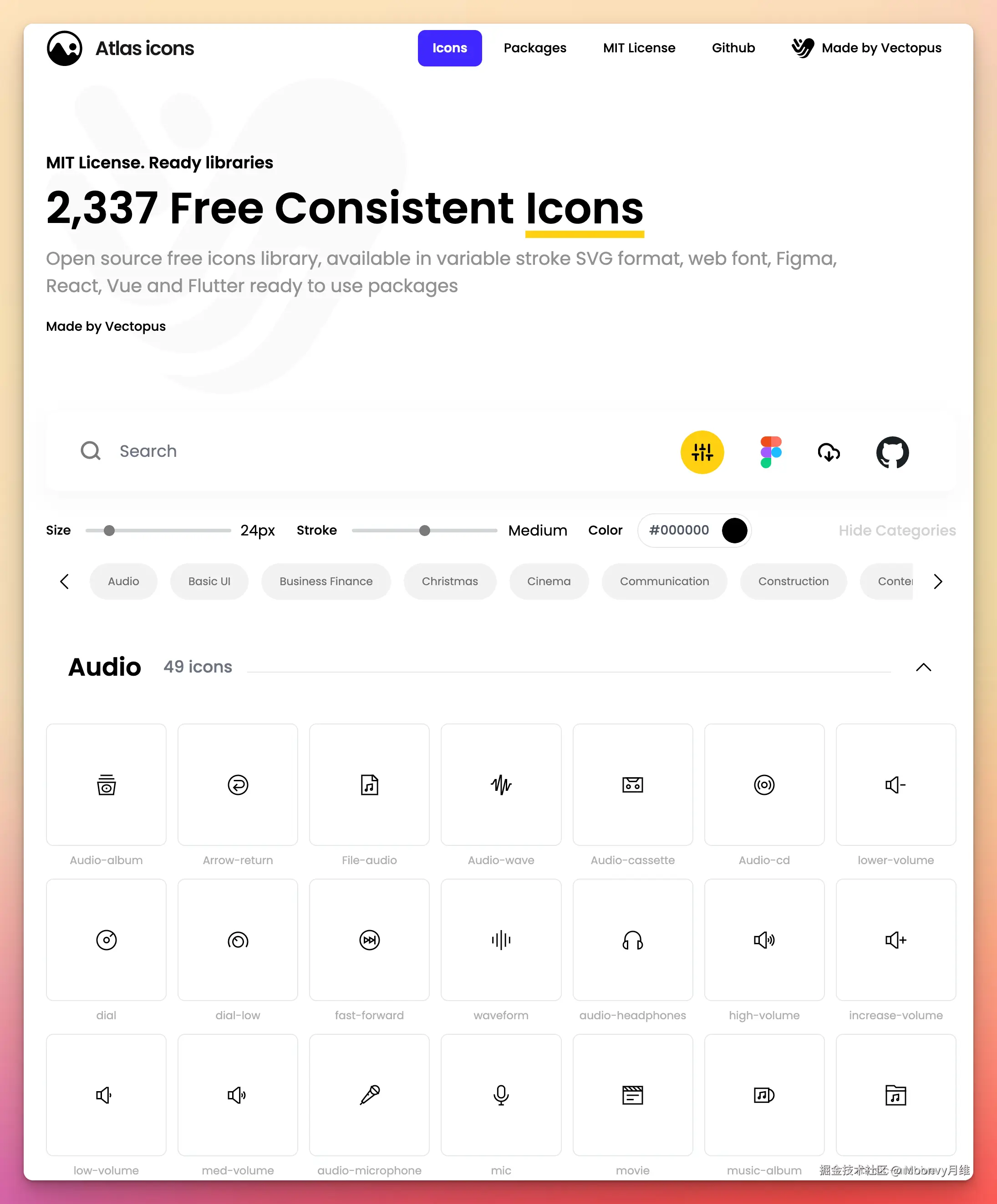 新的一个开源图标库,有 2337 个图标,并且提供了 SVG 格式、网络字体、Figma 插件、React、Vue 和 Flutte 的集成