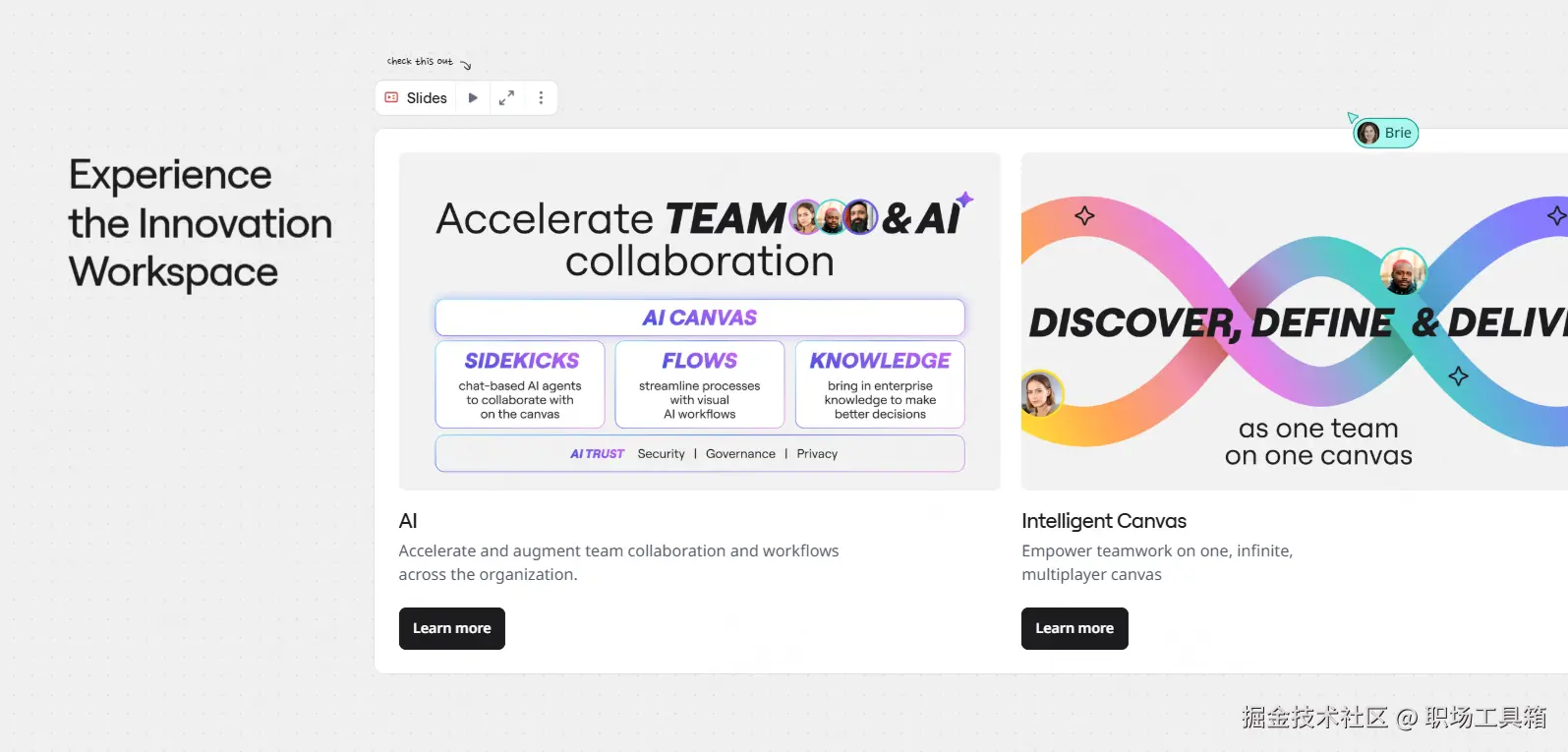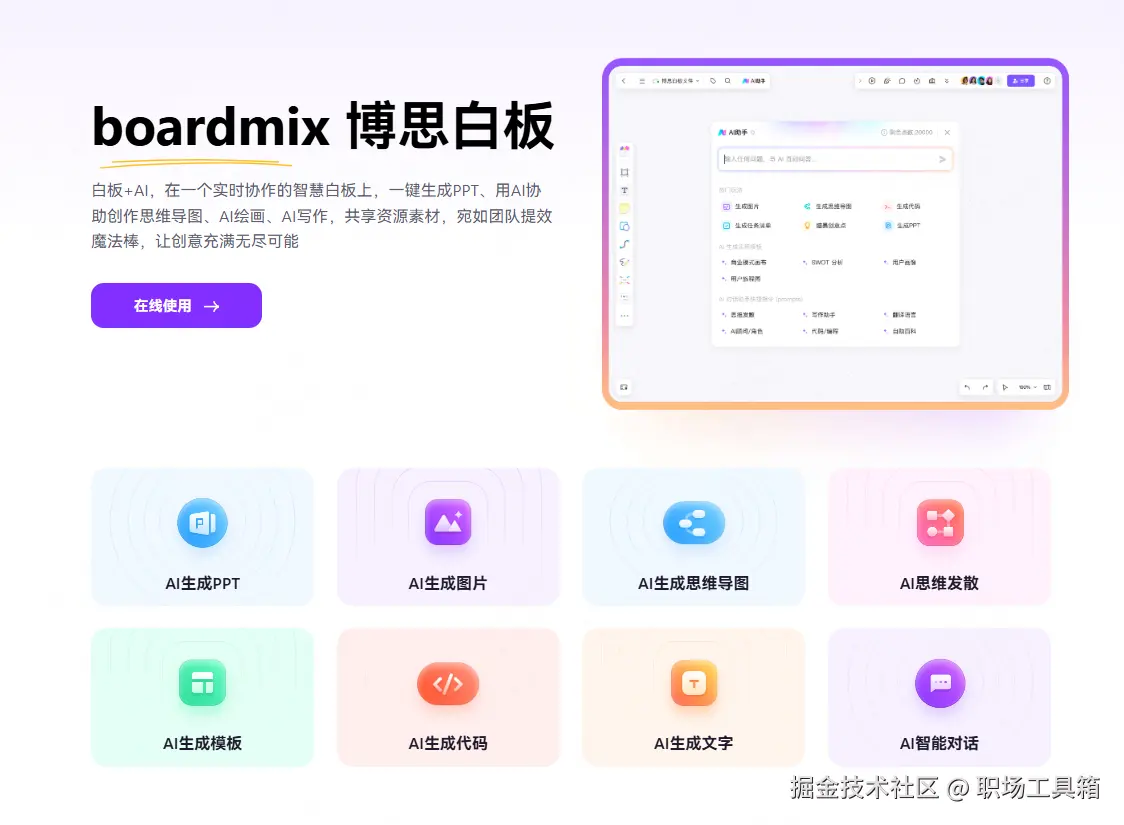 跟别的软件只是加个AI聊天框不同,boardmix 的 AI 是嵌在使用白板的每个流程中。