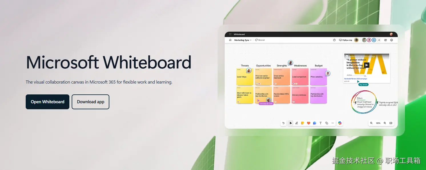 Microsoft Whiteboard 的定位非常清晰,它是微软庞大办公生态中的一块拼图,给使用 Office 的用户提供了额外的选择,满足各类可视化呈现和表达需求。
