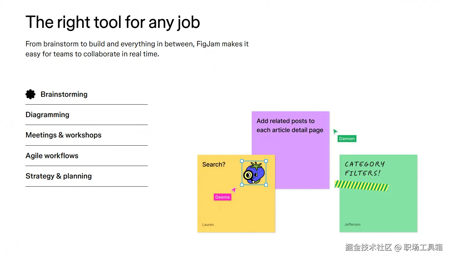 FigJam 是在线设计工具 Figma 推出的在线白板,它的诞生某种程度上延续了 Figma 的设计哲学,主打轻量级、高互动和设计流无缝衔接。