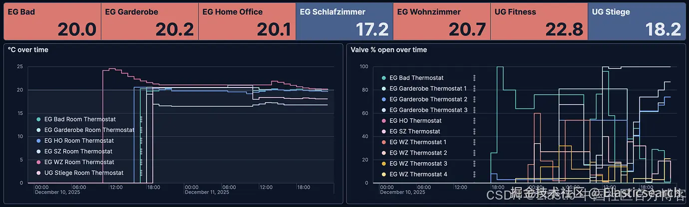 打开 Kibana → 仪表板 → “Smart Home”,你就能看到数据生动呈现。预构建的仪表板会显示各房间的温度随时间的变化,以及暖气恒温阀开度的百分比。每个事件都带有人类可读的设备名称和房间信息,不必盯着难懂的设备 ID。