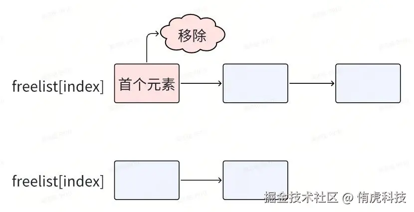 - 将新链表的首节点地址作为ok_freelist[N],N是上文提到的GRANULE,例如16字节对应1。