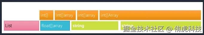 在上图中,白框表示分配给托管堆的内存量,而其中的彩色框表示存储在托管堆的内存空间中的数据值。当需要更多值时,将从托管堆中分配更多空间。
