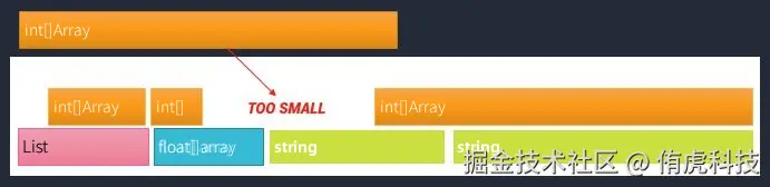 - 堆内存碎片会造成两个结果:一个是游戏占用的内存会越来越大;一个是GC会更加频繁地被触发。