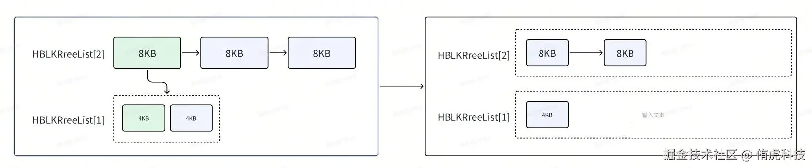 如上图示例,如果要申请1KB,则会先找4KB,如果没有4KB则去找8KB,找到了8KB就进行两个4KB的拆分,然后移除8KB出池子,再把拆分过的另一半4KB内存块加入到池子里: