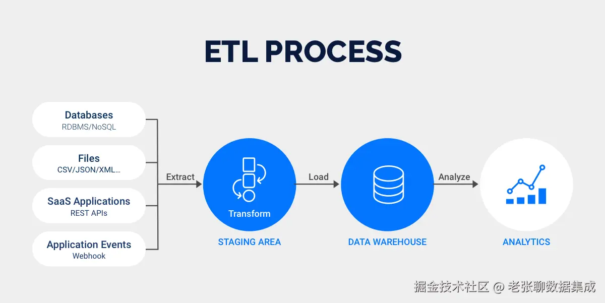 最传统成熟的模式,核心流程“抽取-转换-加载”, 说白了就是先抽源系统数据,中间节点完成清洗去重,再加载到目标系统。