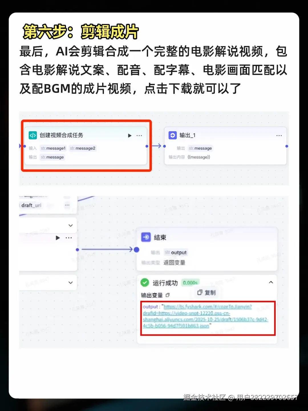 最后一步,AI会将上述所有元素——解说文案、配音、字幕、匹配好的电影画面、BGM——自动剪辑合成。