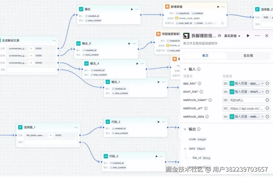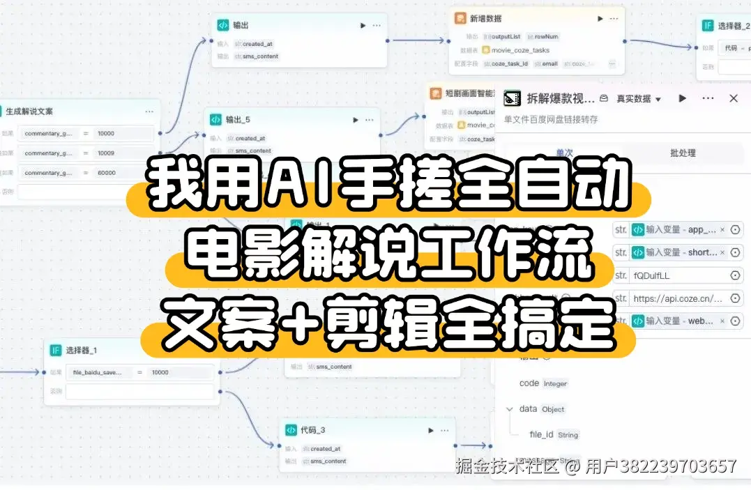 今天不藏了,给大家展示一下我用 Coze(扣子) 搭建的一套 电影解说全自动化工作流。这不仅仅是一个简单的脚本生成器,它是一个能把 文案生成、画面剪辑、配音、配乐、字幕 全都一键搞定的“超级流水线”!