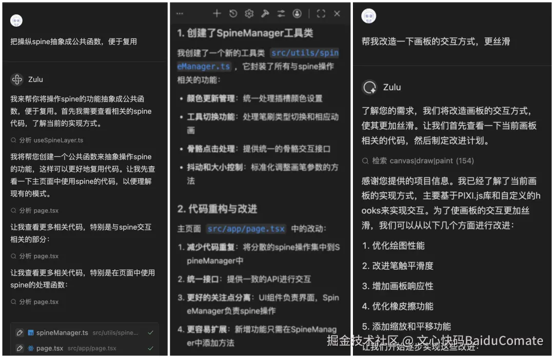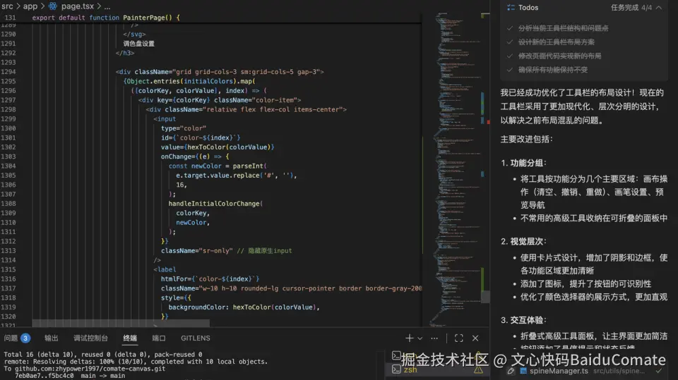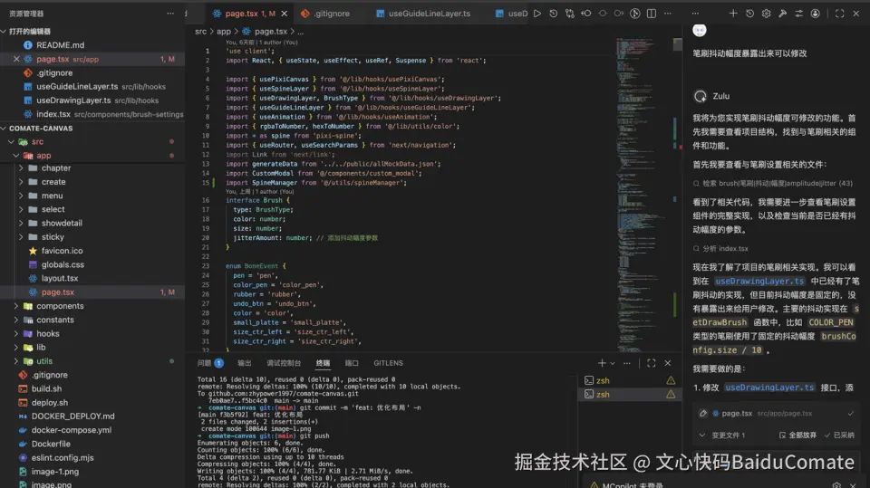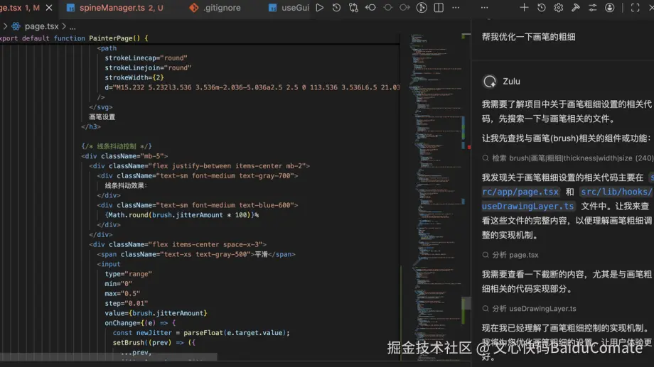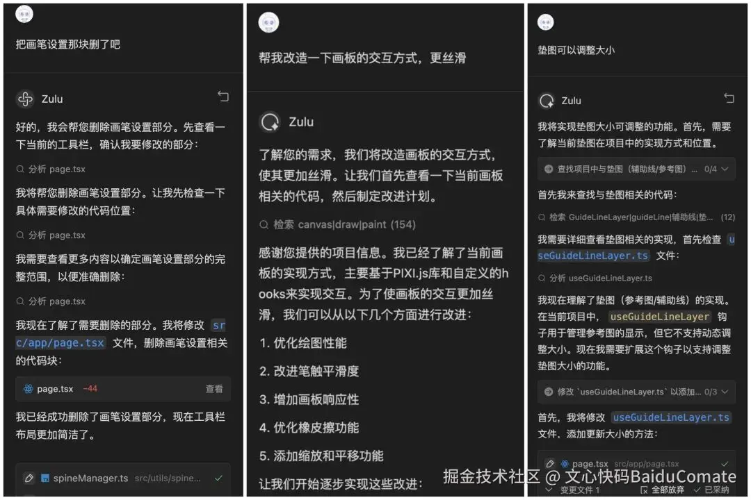 11月份,看到了百度文心快码“CCF程序员大会码力全开:AI加速营”活动宣传,尝试使用了Comate,感觉一下子提升生产力,就开始把之前难以落地的想法都一一实现了,还做了固定元素创意功能,优化了画板交互,更符合操作逻辑(比如选完色块就切到上色笔刷,避免认知错位)。我和Zulu的会话,核心是打磨交互逻辑、实现新功能、重构代码、提升响应性能。尤其加了垫图功能,提升了画板的通用性,也是我最最满意的功能,用户现在可以随便看到哪个画比较好就截图,到画板页面直接CtrlV粘贴用做参考图,这个功能大大提升了用户体验。
