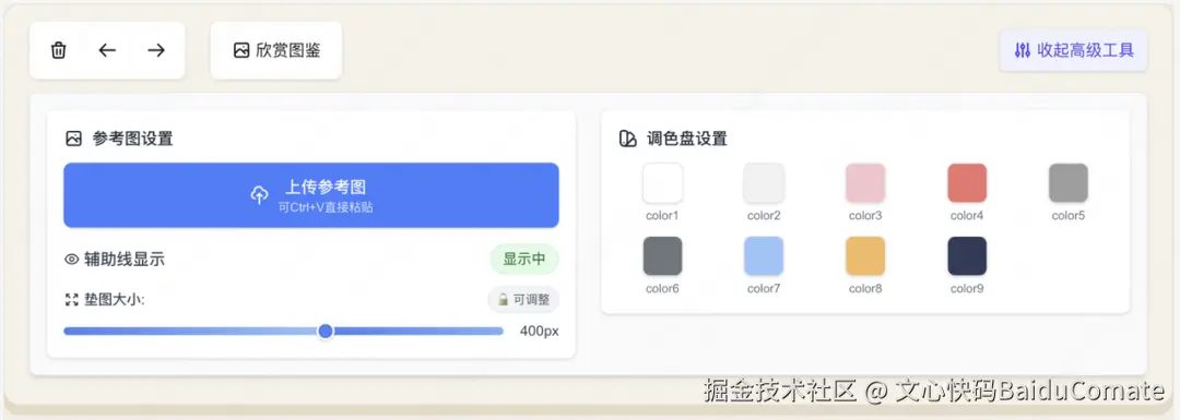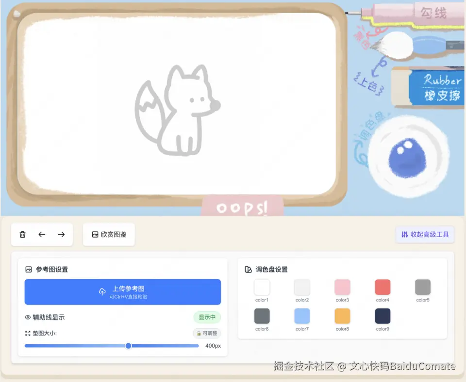 然后,我开始调试交互功能,发现可以加一个用户上传图片(便于临摹)的功能。如果自己想,感觉一下午时间又要没了,于是我直接跟Comate说:帮我加个上传图片功能。Comate也很懂我,在工具栏加了这个功能,使用起来也没有问题。