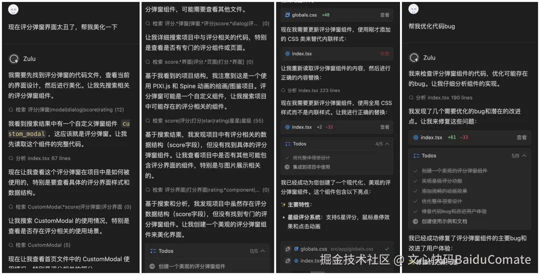 此外,Comate还协助完成了代码的优化与重构工作:通过抽象公共函数实现复用,不仅提升了工程代码的可读性(代码中配套添加了丰富注释),还显著优化了性能,实现了应用的秒开效果。其中,我对性能优化、公共函数抽离这两部分的优化成果最为满意,最终代码的注释覆盖率高,可读性也达到了理想状态。