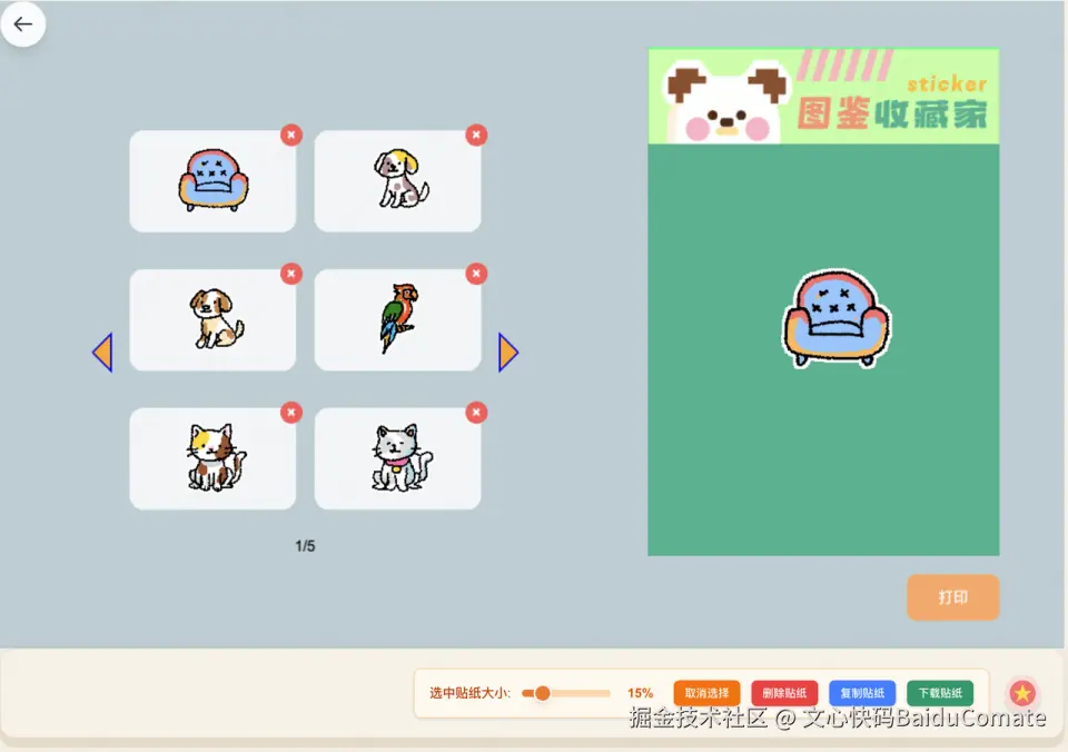 这时,导出来的贴纸,其实是贴纸集,有时候我觉得某个贴纸很好看,想单独下载,于是,Comate贴心增加了下图工具栏选择、复制、删除贴纸等功能,甚至能直接粘贴到剪切板,用后即焚。