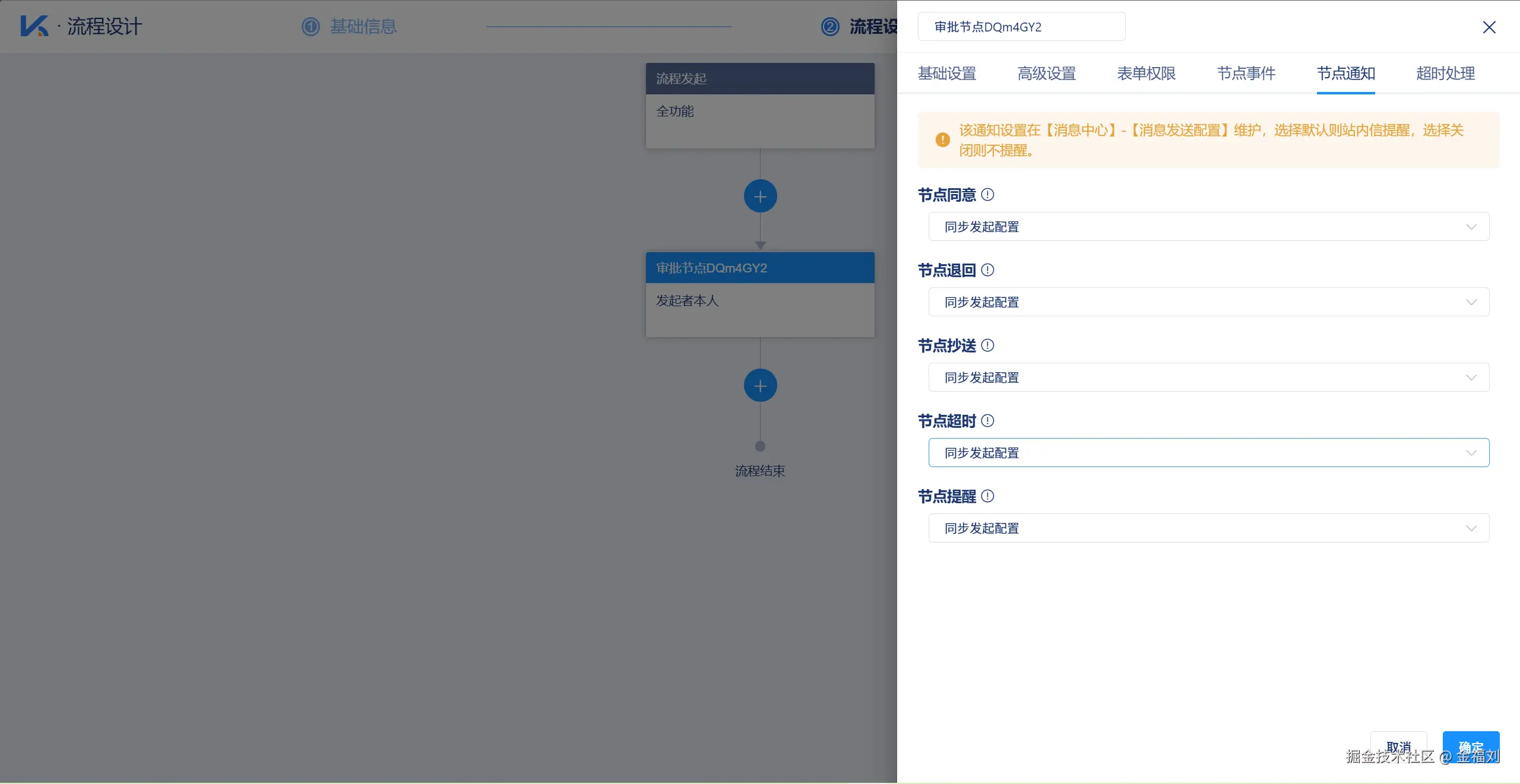 流程设计支持配置节点通知、超时提醒和自动催办功能。
