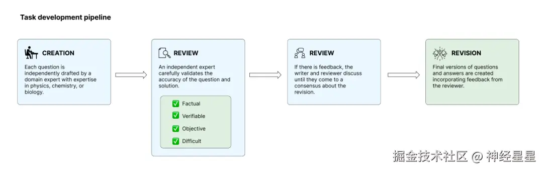 为确保问题的原创性和严谨性。研究团队在内部模型测试阶段对题目进行了筛选,并剔除已被现有模型轻易解决的问题,以降低评测饱和风险。训练任务总计会经历创建、审核、解决和修订 4 阶段,独立专家会相互审核各自的任务,以确保其符合标准。最终,团队从数百道候选问题中筛选出 160 道开源题目,其余题目则作为保留集,用于后续污染检测与长期评测。
