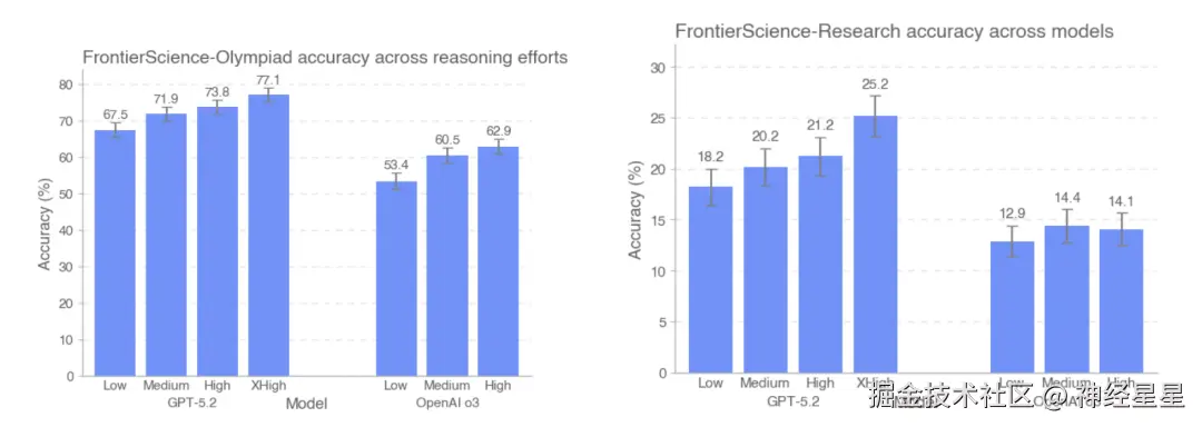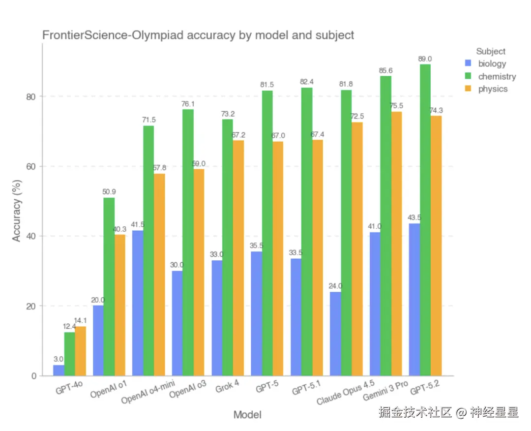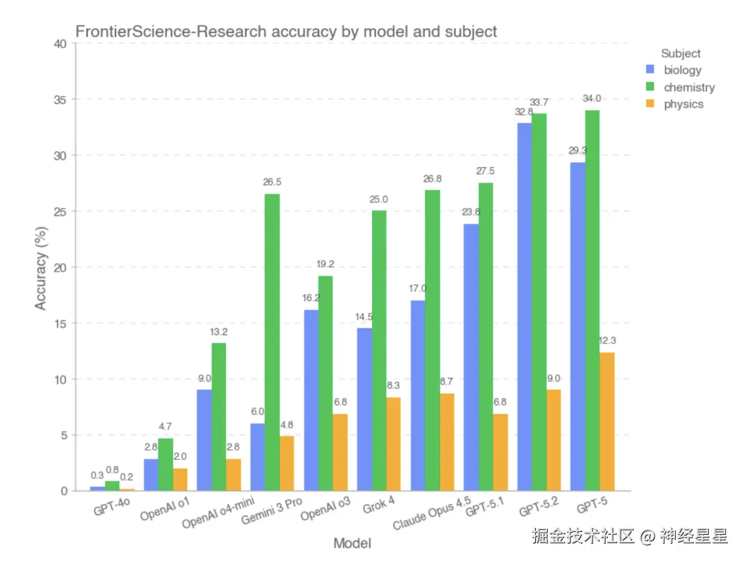 从整体实验结果来看,FrontierScience 基准在两类任务上呈现出较为清晰的性能分化趋势。