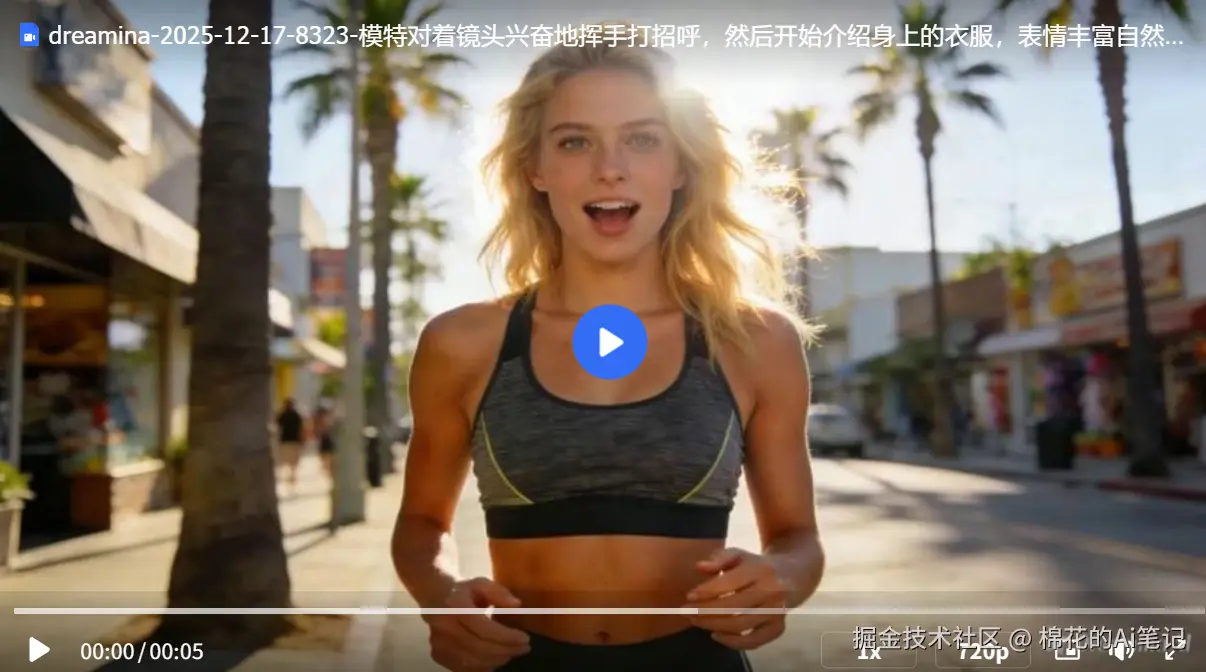 提示词:模特对着镜头兴奋地挥手打招呼,然后开始介绍身上的衣服,表情丰富自然。