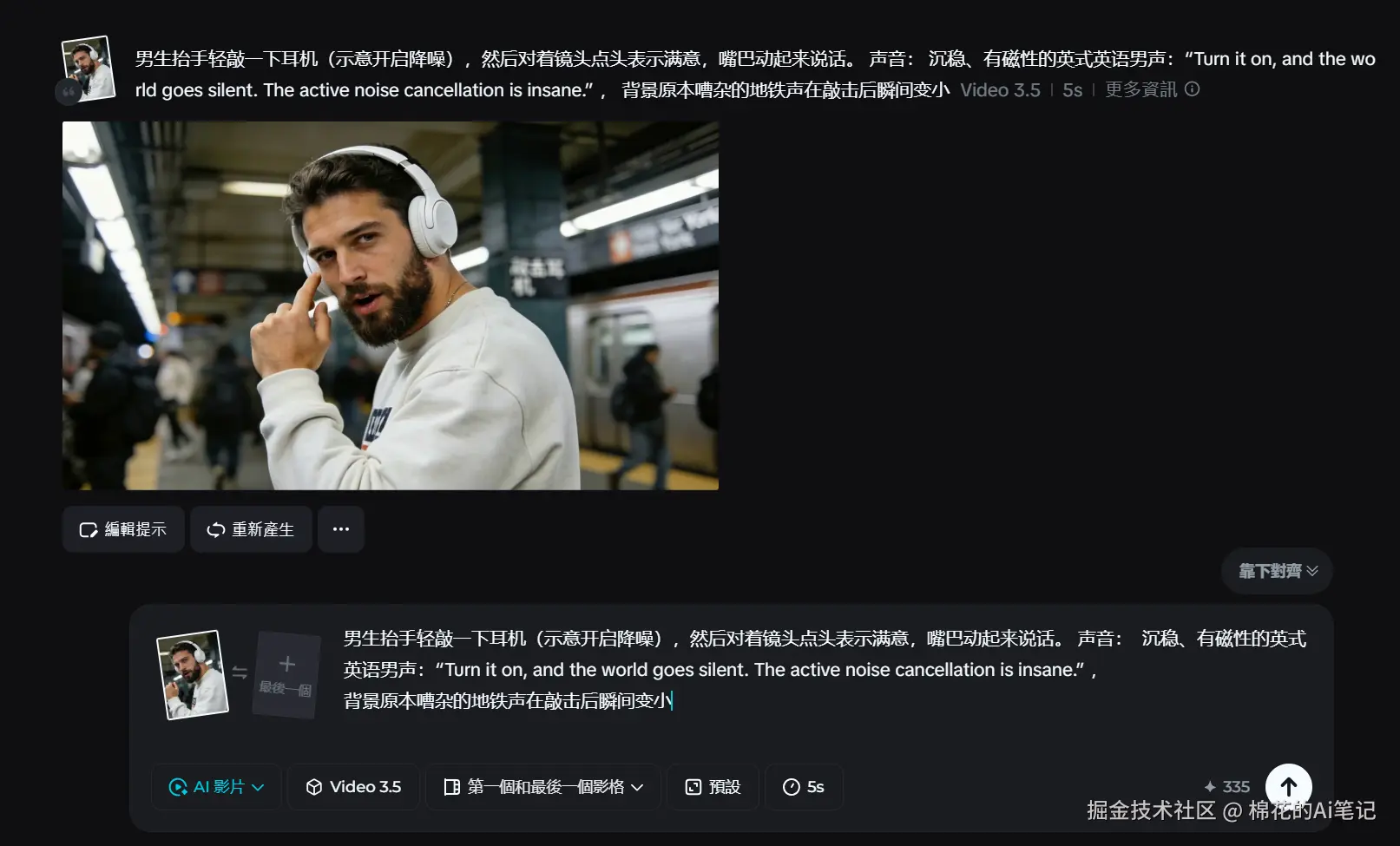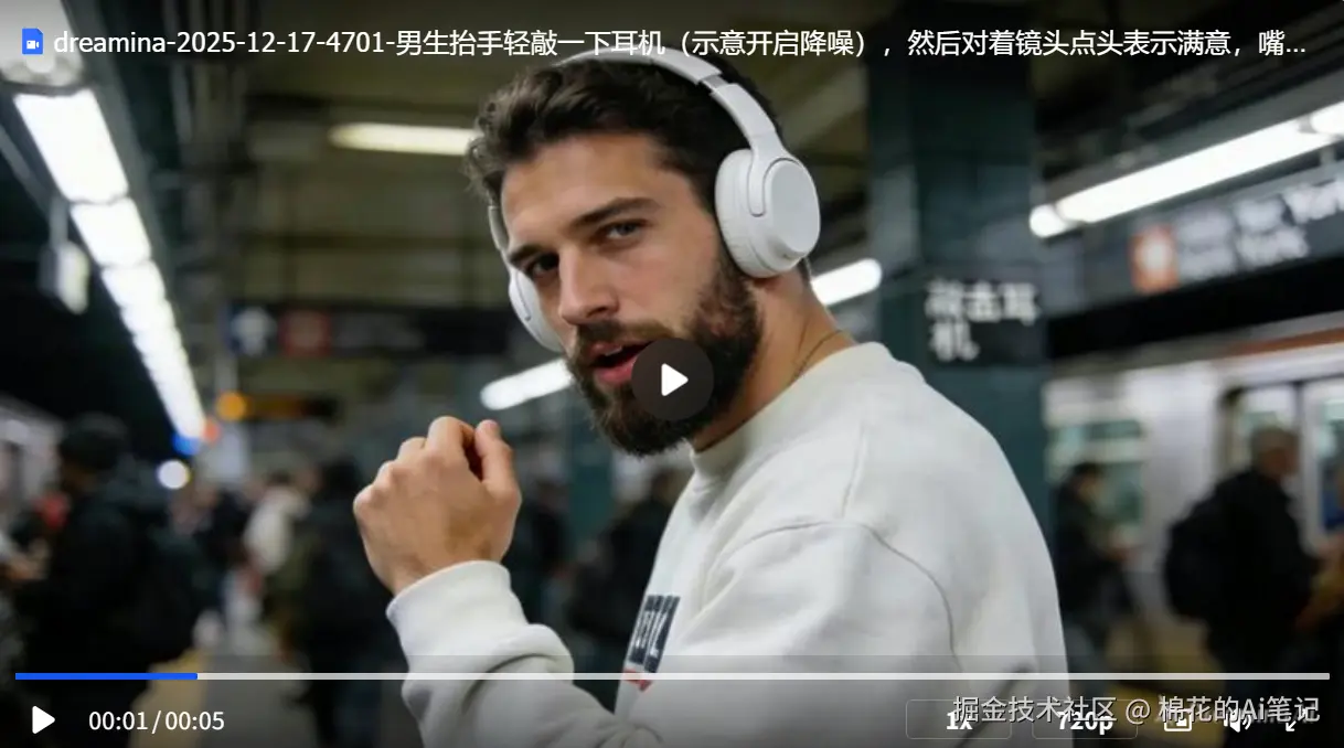提示词:男生抬手轻敲一下耳机(示意开启降噪),然后对着镜头点头表示满意,嘴巴动起来说话。