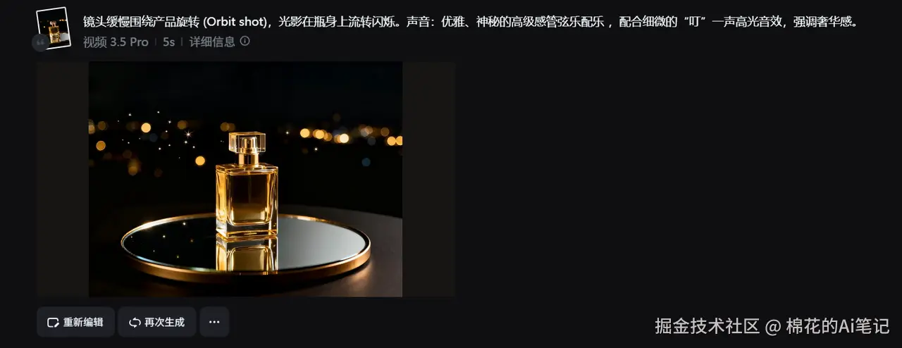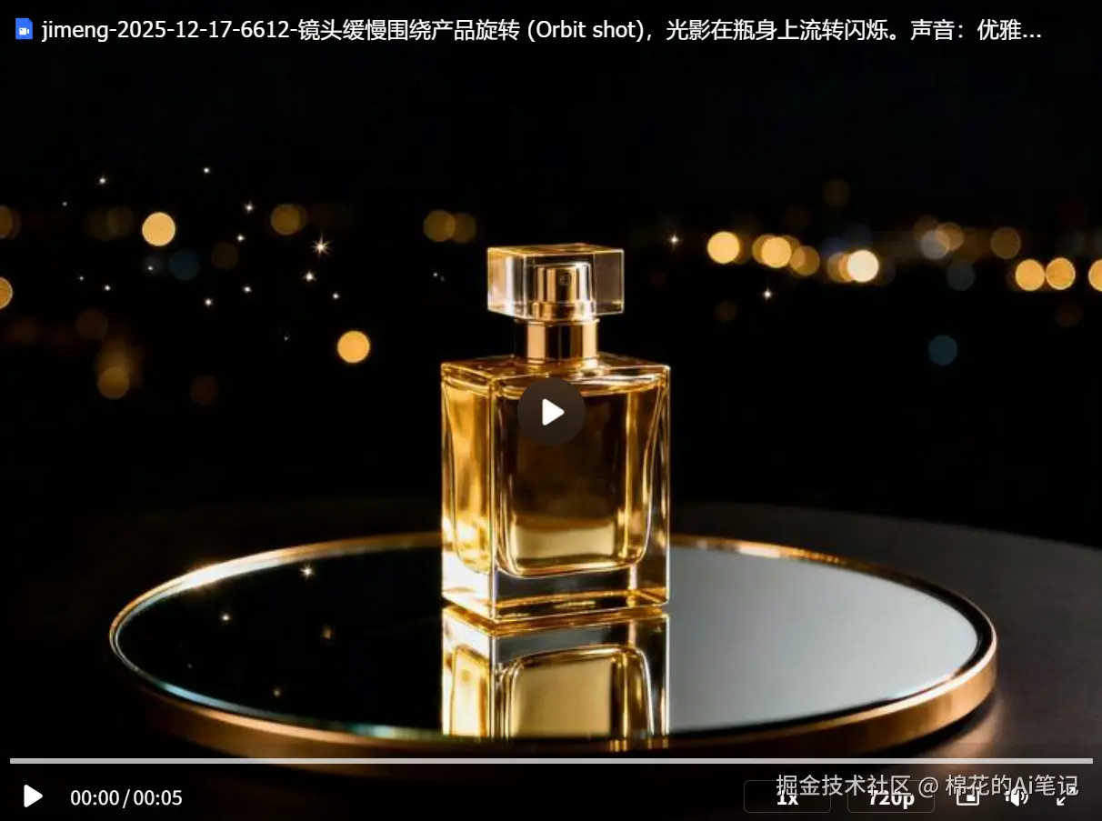 提示词:镜头缓慢围绕产品旋转(Orbit shot),光影在瓶身上流转闪烁,配合细微的高光闪烁特效。