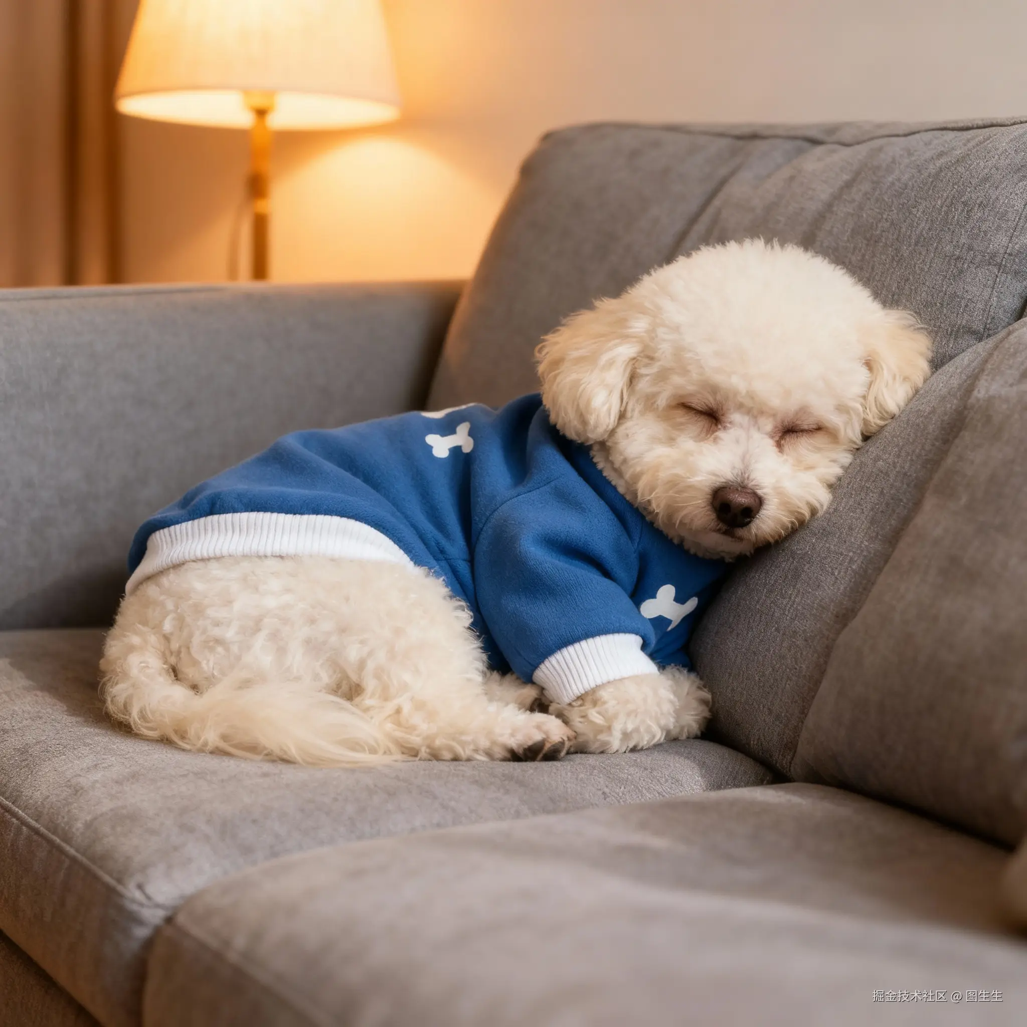 “浅灰色居家沙发,奶油色比熊犬穿着这件蓝色宠物卫衣蜷在沙发上打盹,背景有暖光台灯”;