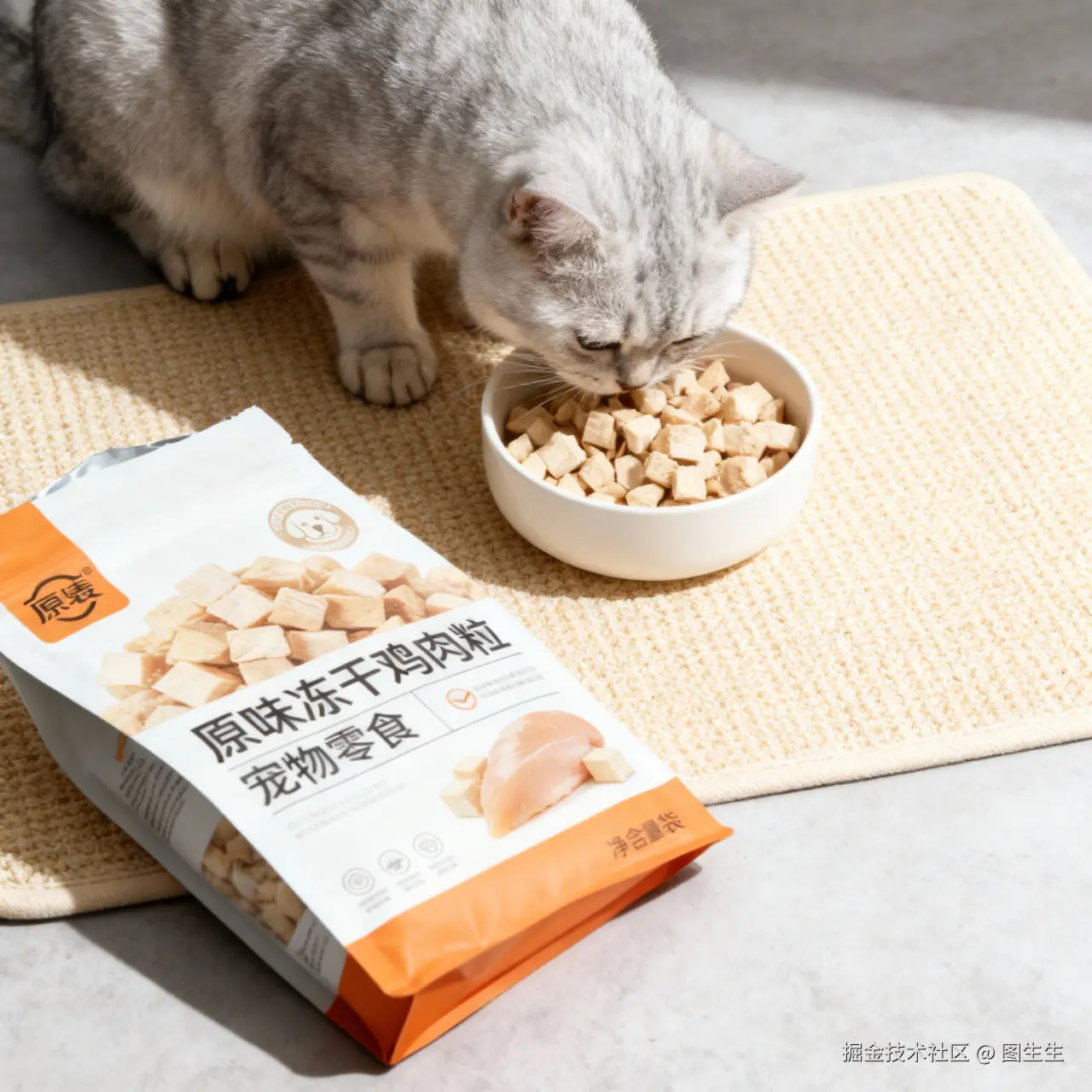 “原味冻干鸡肉粒(零食袋敞开摆在旁),米色宠物垫上,银渐层英短猫低头专注吃碗里的鸡肉粒,碗内装满鸡肉粒”;
