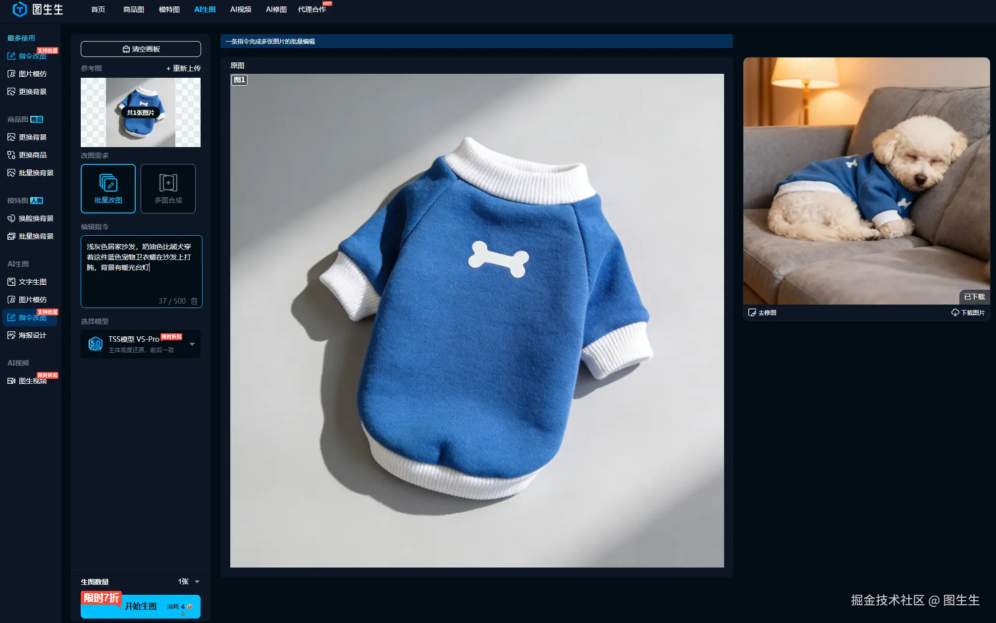 图生生指令改图功能可以解决这一难题,上传宠物产品图,输入简单指令,一键生成带宠物的真实场景图!让电商人解放双手!