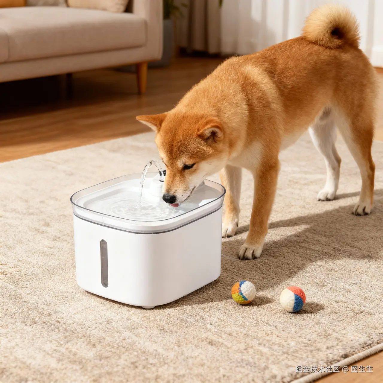 “客厅地毯旁,浅棕色柴犬低头喝饮水机里的水,旁边散落1-2个宠物小球”。