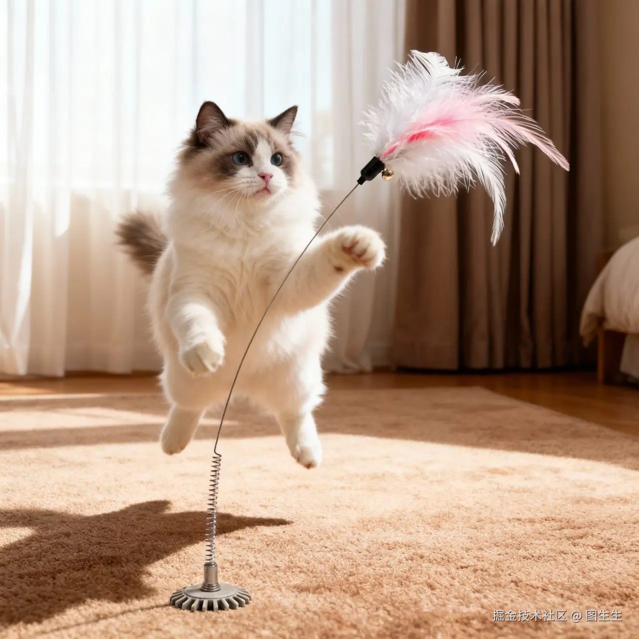 “浅棕色卧室地毯,一只布偶猫跃起抓这个逗猫棒,眼神灵动,背景有落地窗帘”;