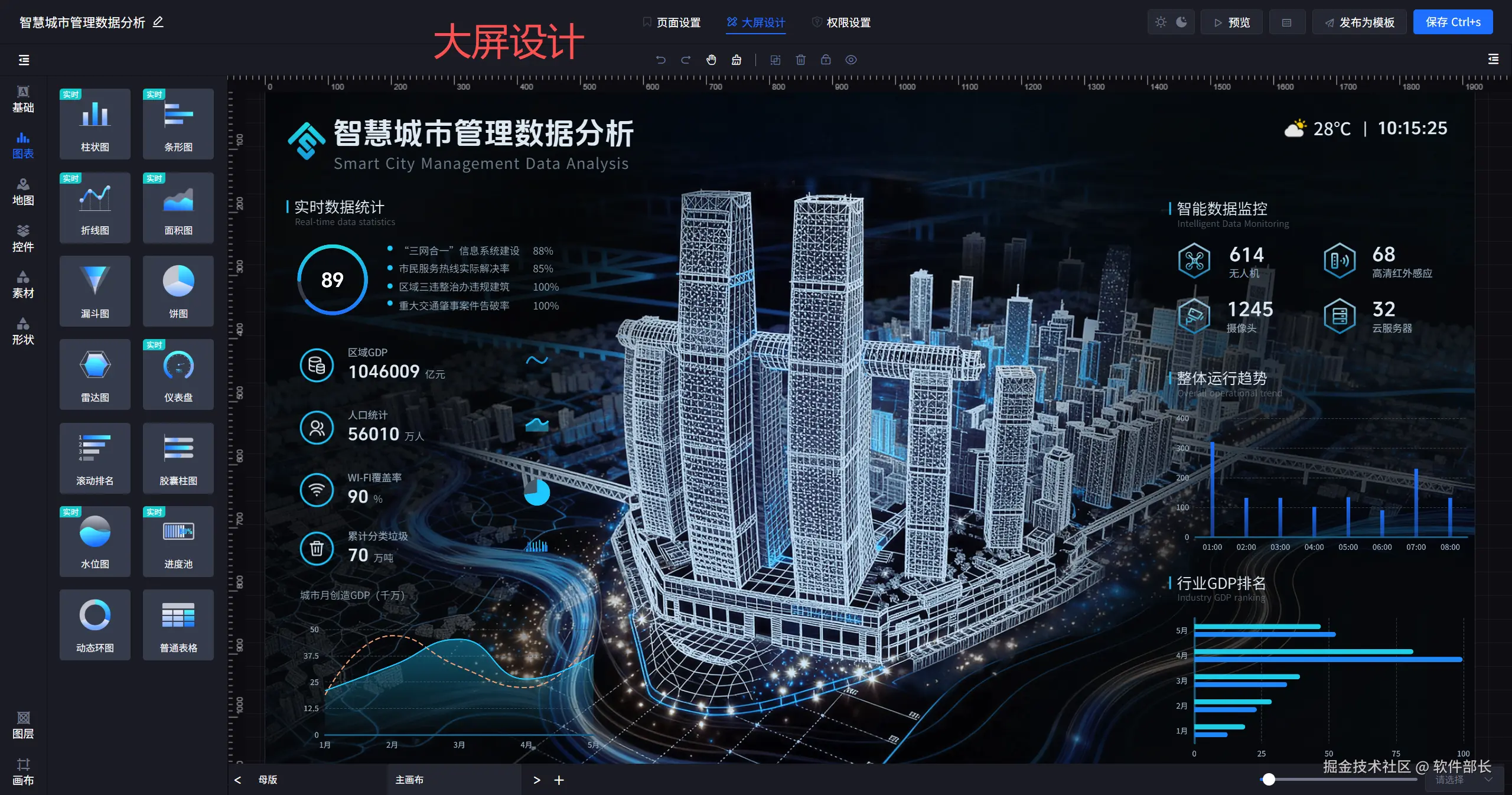 - **数据可视化:**通过拖拽式配置可视化图表、报表、大屏。系统支持丰富的图形组件和数据联动机制,支持联动、钻取、跳转、等交互。使图表在交互时自动更新,直观展现数据趋势和关系。报表类型涵盖交叉报表、分组汇总表等,满足不同场景的展示需求。