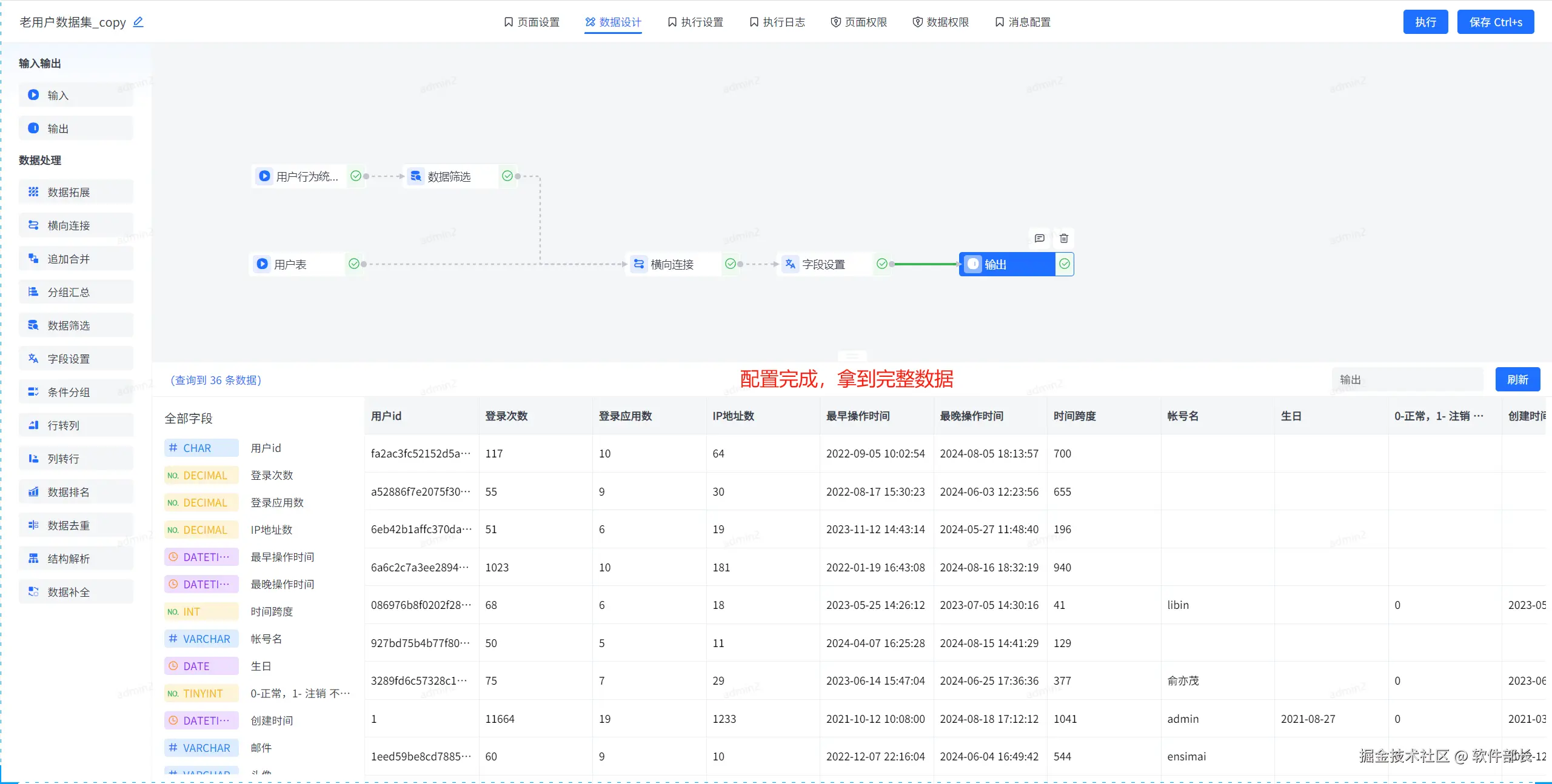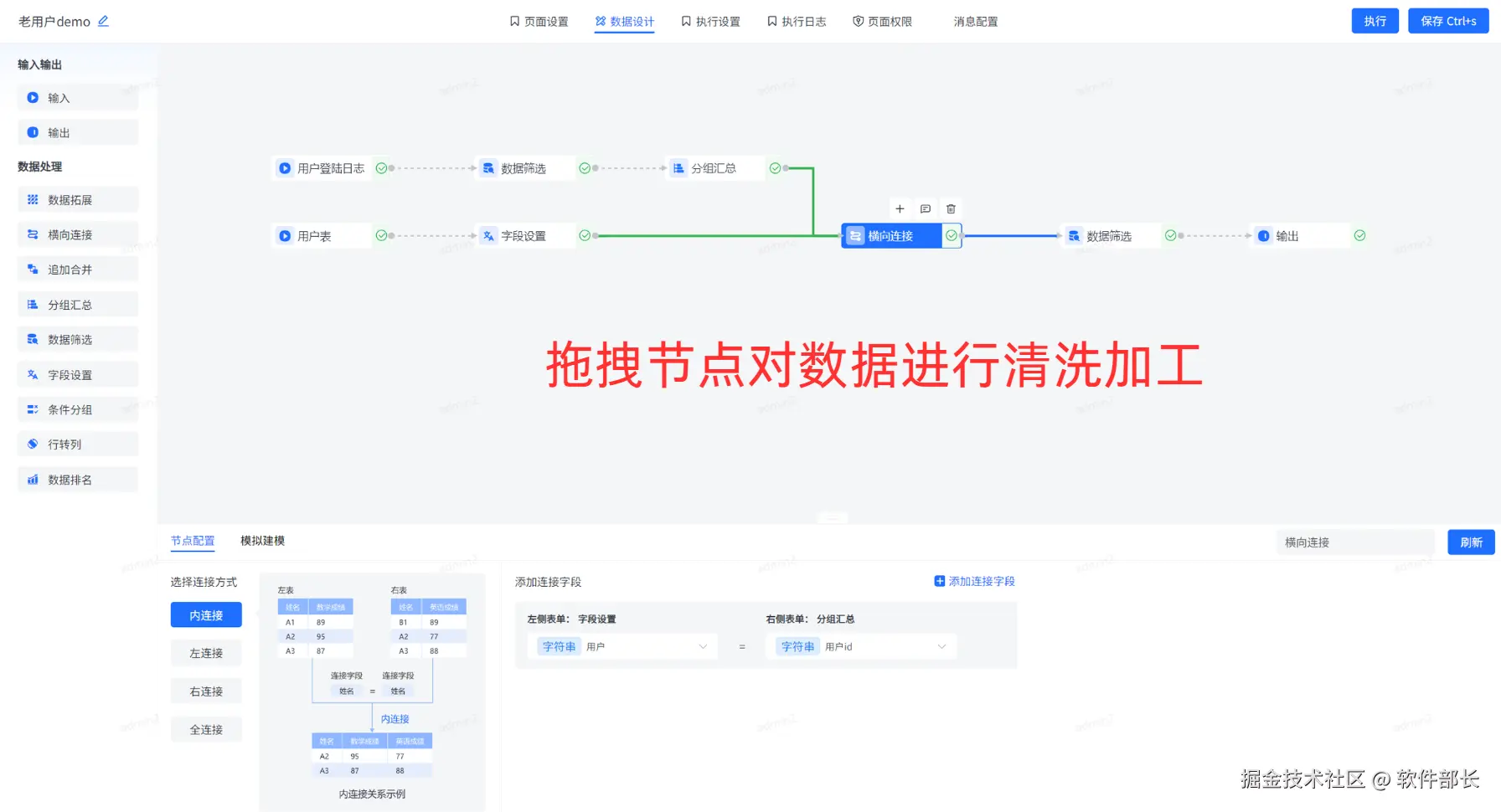 - **数据集清洗加工:**主要承担数据存储、处理和应用的基础角色。通过可视化ETL工具对原始数据进行抽取、清洗、转换和建模,生成标准的数据集。这一过程通过拖拽式操作实现,包括字段计算、数据关联等加工步骤,最终形成可用于分析的标准化数据集合。