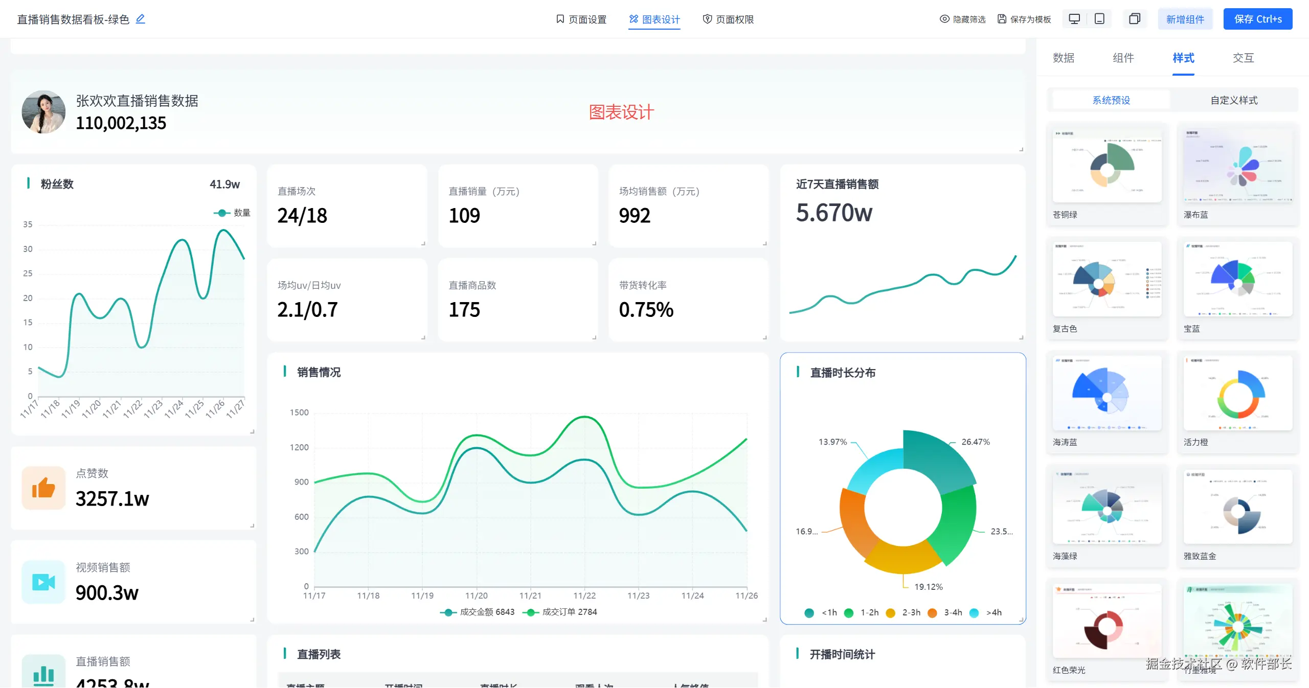 - **丰富的可视化组件:**平台内置40余种可视化组件,包括表格、趋势图、柱状图、饼图等,支持数据钻取、联动、跳转等交互操作,帮助用户深入洞察数据背后的规律。