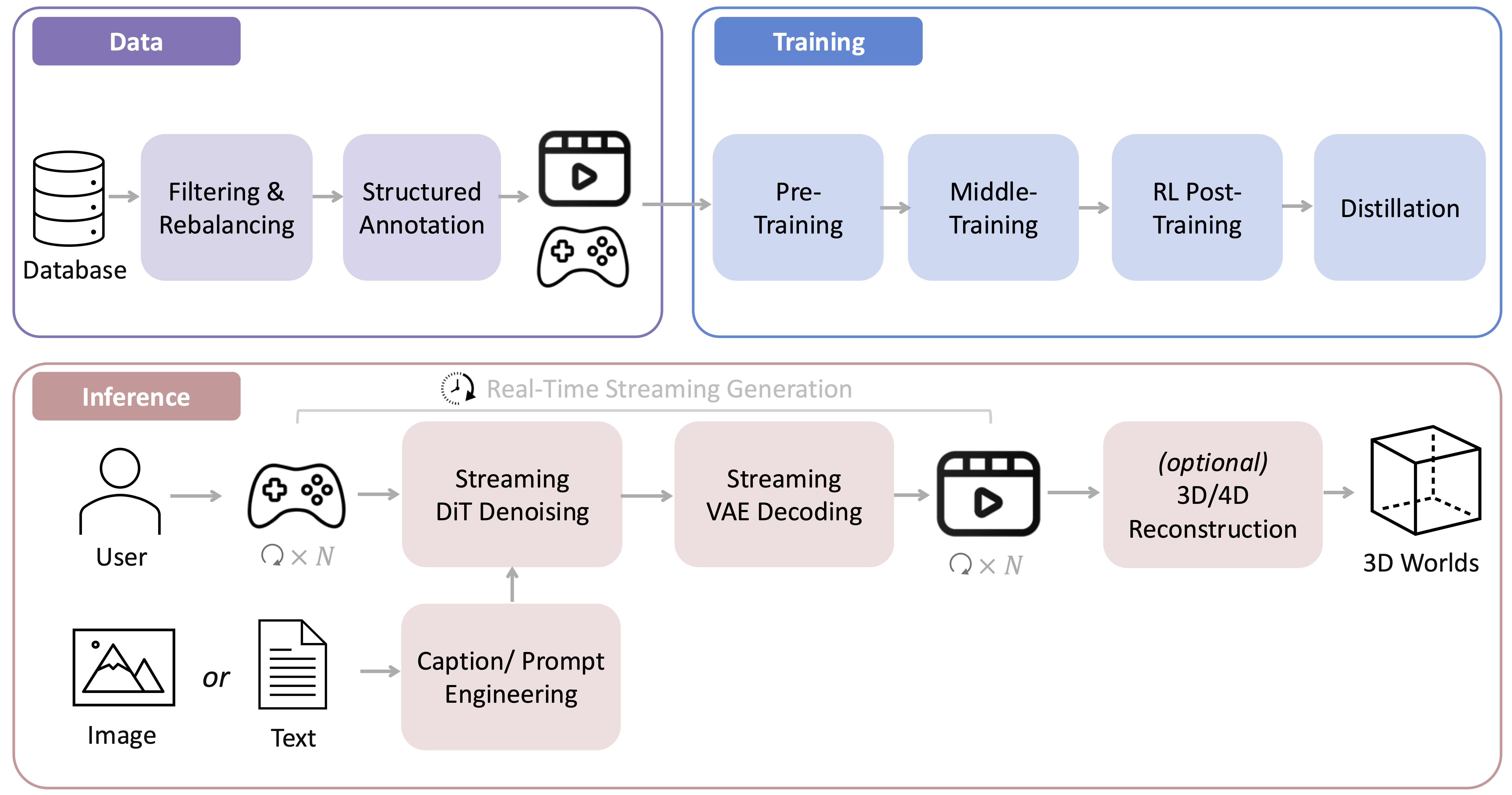 HY-World 1.5开源提供了一个系统全面的实时世界模型框架,涵盖了整个流程和所有阶段,包括数据、训练和推理部署。技术报告介绍了模型式预训练、强化学习训练和记忆消耗模型的详细训练。此外,报告介绍了一系列旨在减少网络传输延迟和模型推理延迟的工程技术,从而为用户实现实时流推理细节体验。