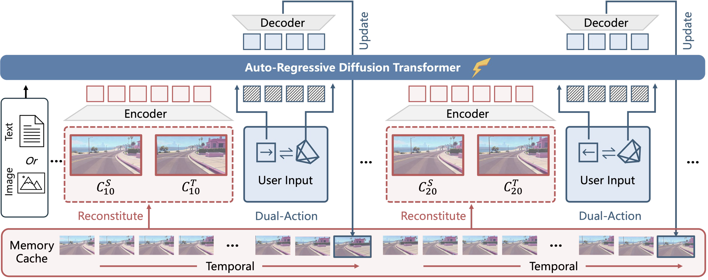 给定单张图像或文本提示来一个世界,我们的模型执行下一个(16个视频帧)预测任务,用户的动作生成未来视频。对于每一个的生成,我们从过去的块动态重构上下文记忆,以强制长期时间和几何块的一致性。