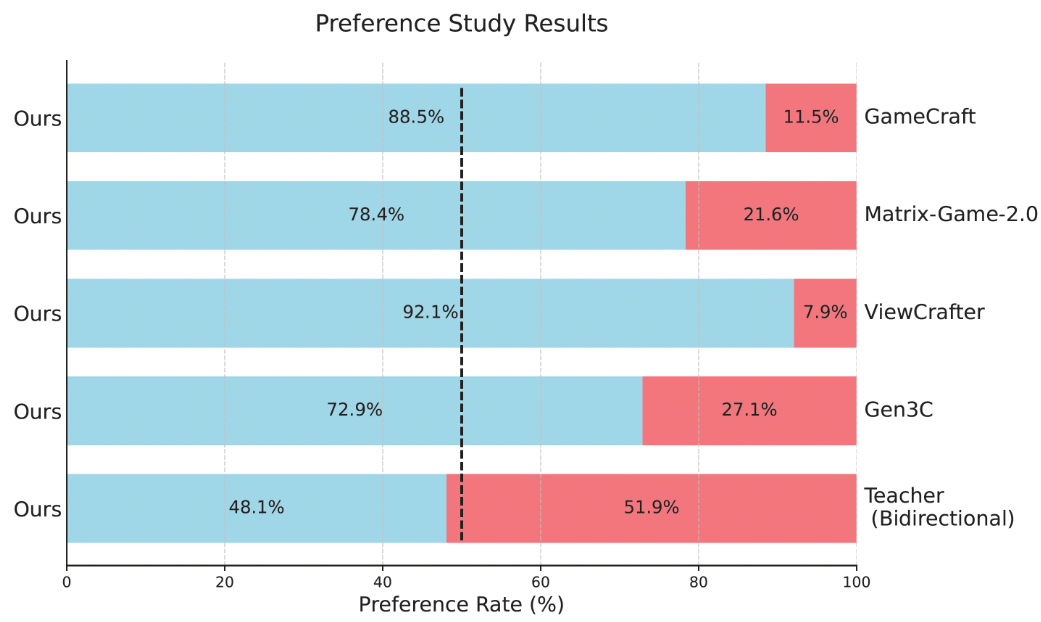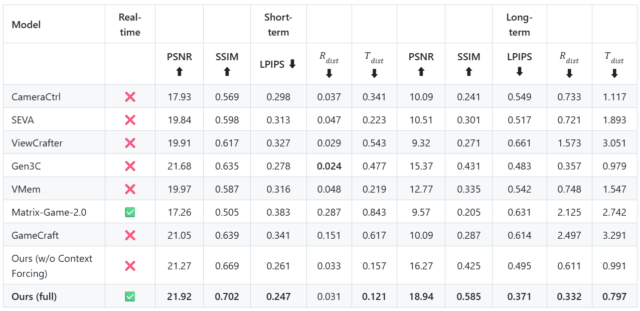 HY-World 1.5在各种定义指标上超越了现有方法,包括不同视频长度的重建指标和人工评估。