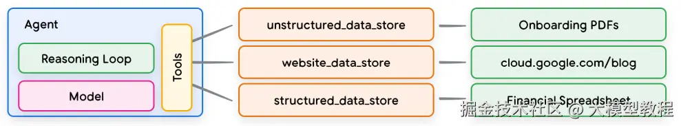常见的工具类型包括 扩展(Extensions)、函数调用(Functions) 和 数据存储(Data Stores) 等,它们各自承担不同职责,共同构建了智能体与外部环境交互的能力。下面分别介绍这几种工具类型: