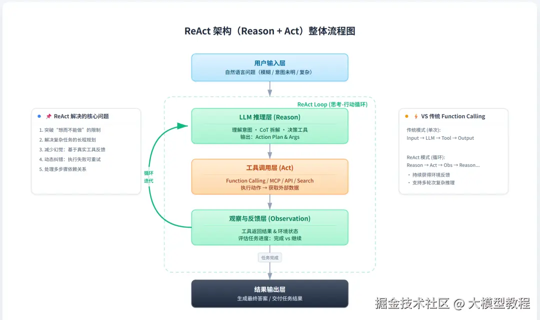 ReAct 规定了:先思考(Thought)→ 行动(Action)→ 等待结果(Observation)→ 再思考...