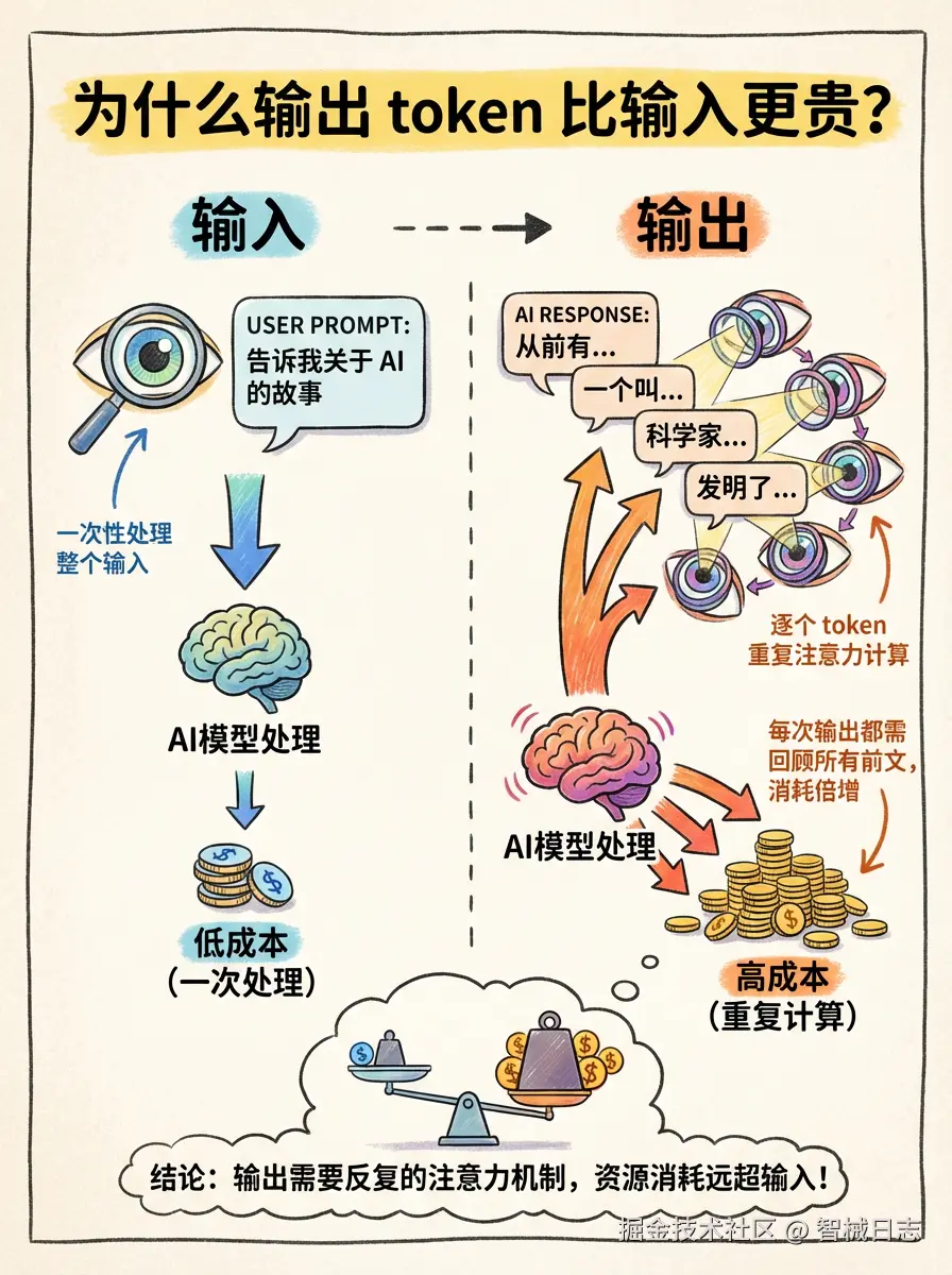 输入只消耗一次注意力,输出是在持续消耗注意力。所以输出更贵,是必然的。