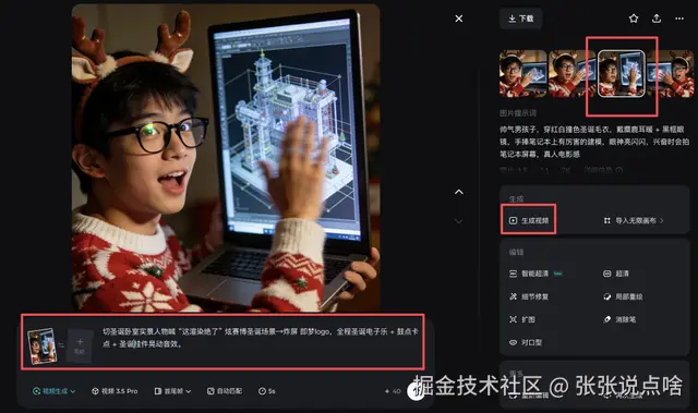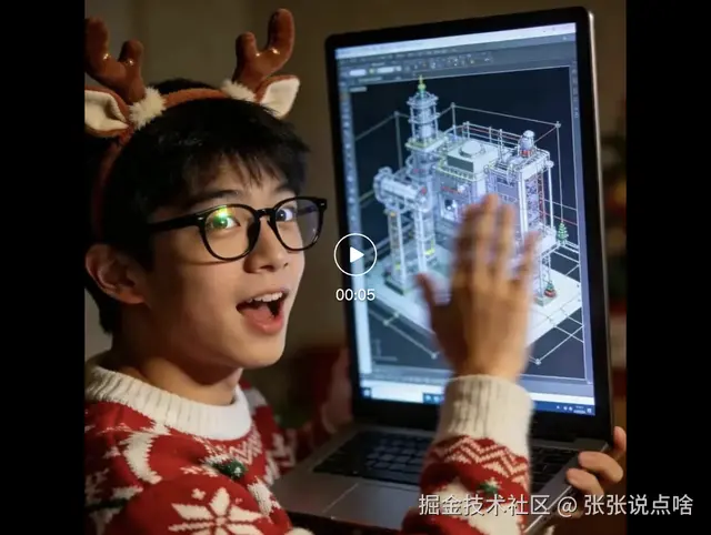 提示词:帅气男孩子,穿红白撞色圣诞毛衣,戴麋鹿耳暖 + 黑框眼镜,手捧笔记本上有厉害的建模,眼神亮闪闪,兴奋时会拍笔记本屏幕,真人电影感