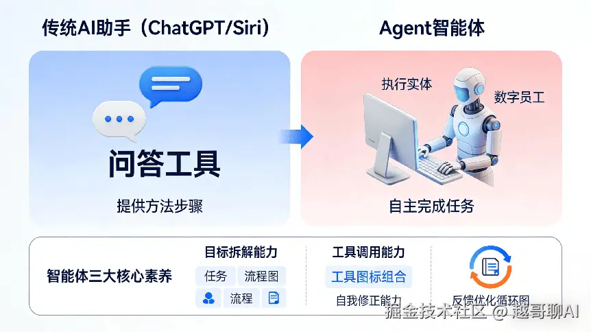 在接触具体产品前,我们得先搞清楚一个核心问题:Agent智能体和我们平时用的ChatGPT、 Siri有什么不一样?简单说,传统AI助手是“问答工具”,而Agent智能体是“执行实体”——前者给你方法,后者帮你完成。