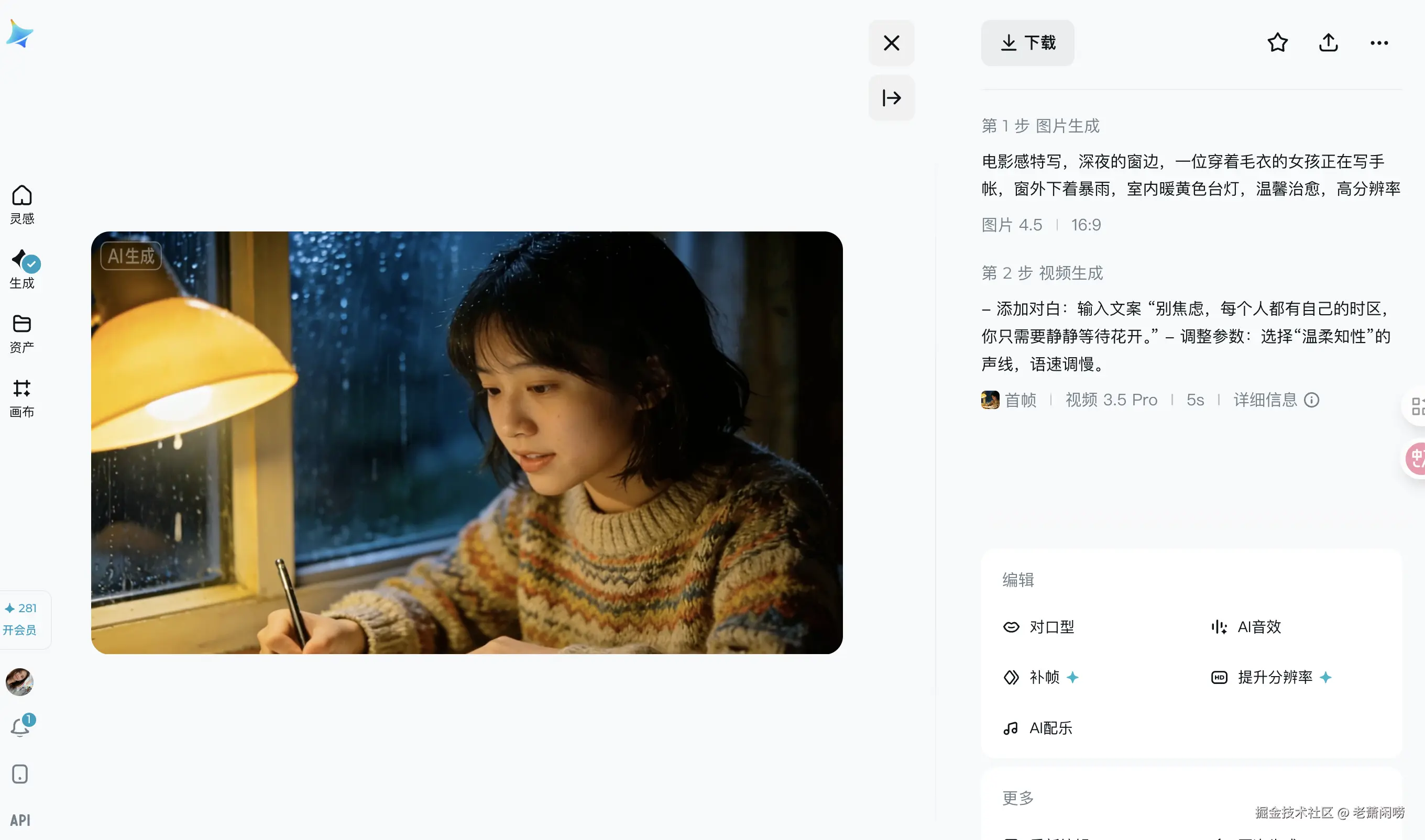- 玩法:生成“雨夜读书”、“海边散步”的视频,即梦AI能自动配出“翻页声”和“海浪声”,治愈感拉满。
