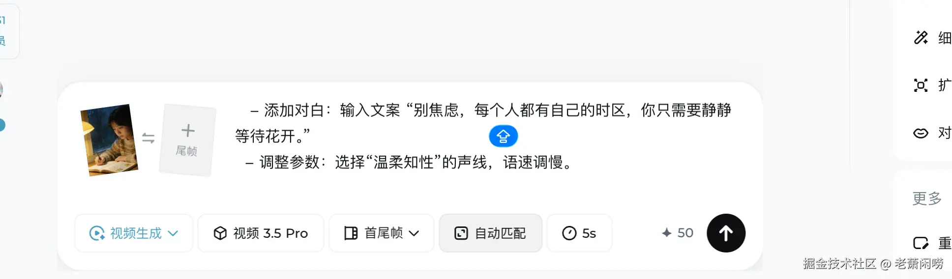 即梦解法:直接在生图界面一键转视频,选择 视频 3.5 Pro,开启“音画一体”。