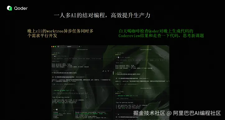 在实际开发场景中,Qoder 的高效协作模式展现出显著优势:通过结构化指令可批量处理多个需求,例如晚间通过简单指令创建四个独立工作树(worktree),每个需求生成独立分支并触发自动化任务执行,次日仅需执行合并命令即可完成需求交付。