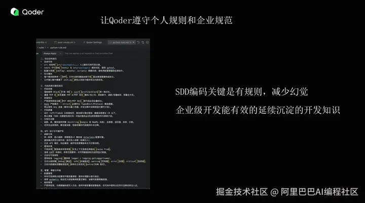 在 Qoder 开发实践中,我们首先需要完成"磨刀"阶段——通过预设的 Python 开发规范与企业级约束体系构建基础框架。在此基础上,我们采用端到端的0到1开发模式,除规则设定外,还通过结构化提示模板(Prompt)对AI进行精准引导。