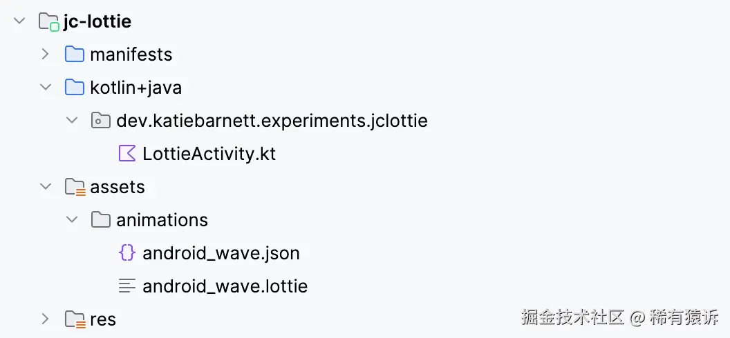 这里唯一的区别是我们需要使用 LottieCompositionSpec.Asset(val assetName: String) 并传递 assets 目录下的路径(你可以根据需要进行组织)。