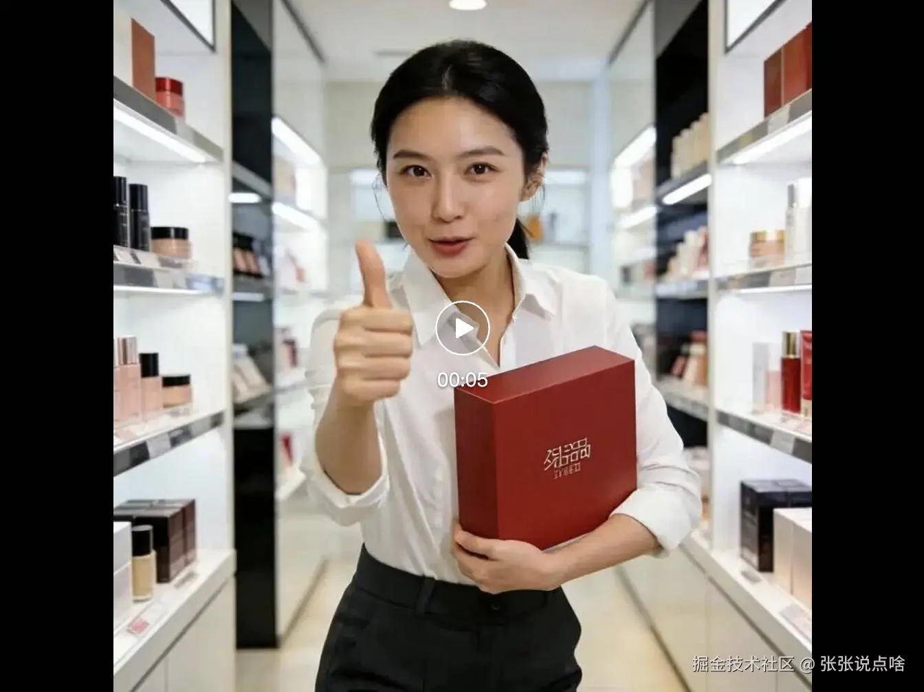 生成可商用高清图片,风格为明亮商务风;单人人物设定:穿干练职业装(白衬衫 + 深色小西裤 / 半身裙),面带亲和自信微笑,手捧主推产品 美妆礼盒 ,站姿挺拔;背景为现代简约门店;光线充足,货架整洁陈列同类产品,无杂乱元素;要求人物轮廓清晰、色彩饱和度舒适统一、产品细节突出,适配后续视频生成