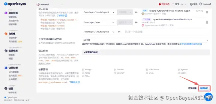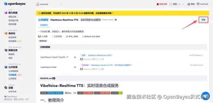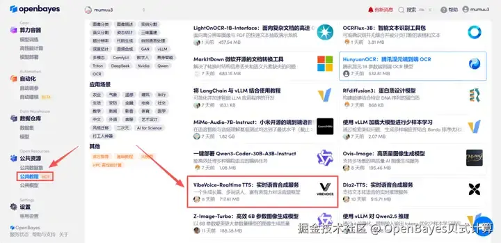 1.登录 OpenBayes.com,在「公共教程」页面,选择「VibeVoice-Realtime TTS:实时语音合成服务」教程。