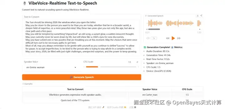 「VibeVoice-Realtime TTS:实时语音合成服务」已上线 OpenBayes 公共教程板块,快来开启你的创作之旅吧!